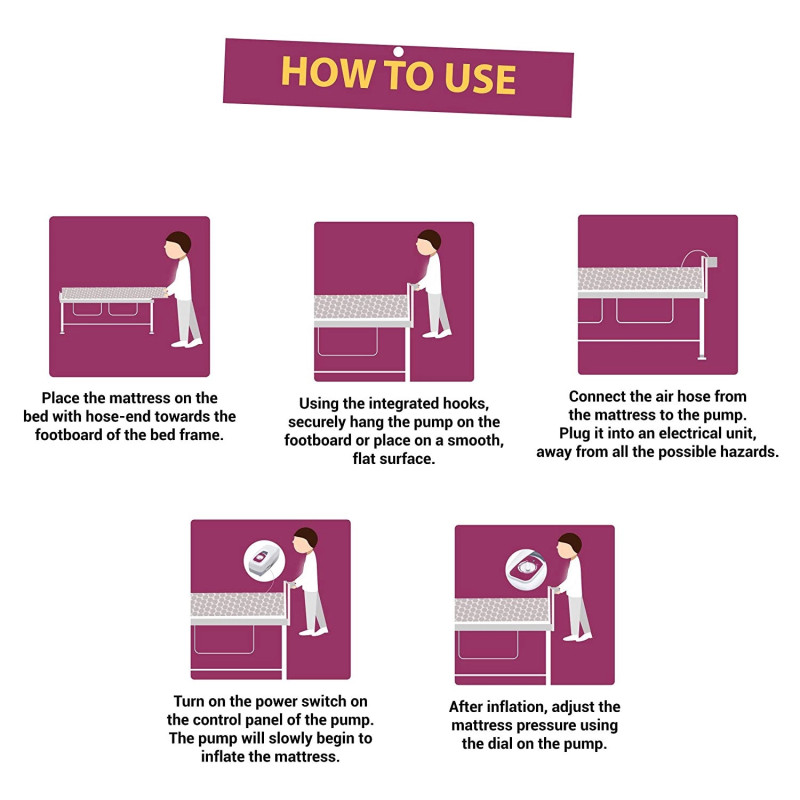 Perfect for home care, hospitals, and elder care facilities, this mattress supports patients who are confined to bed for extended durations. It comes with a compact, low-noise pump that allows adjustable pressure based on the patient’s weight and comfort. The user-friendly setup ensures quick installation and operation.