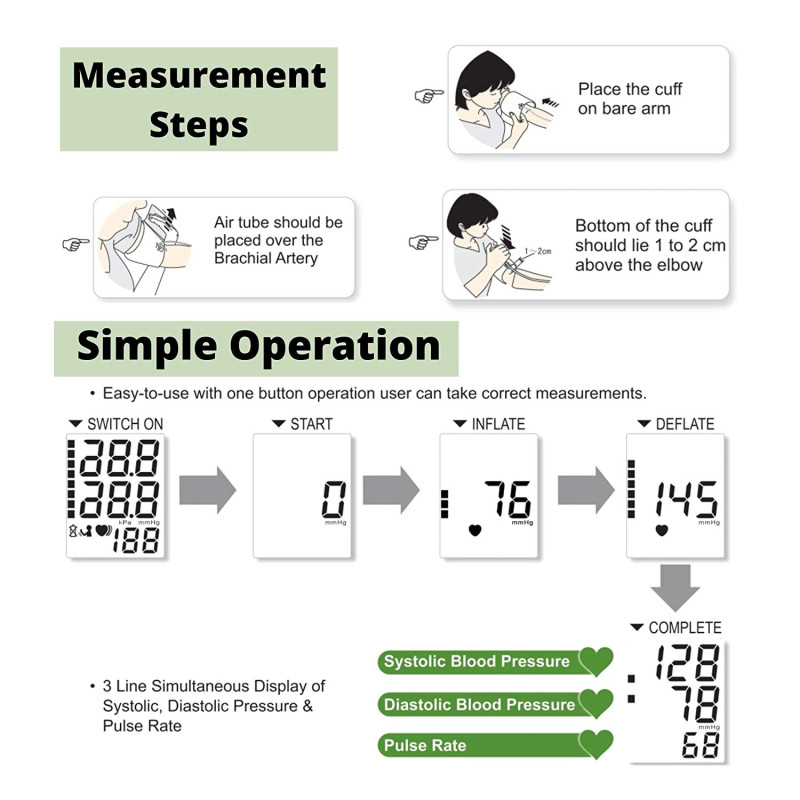 Equipped with a clear, backlit display and large buttons, the Standard BPCare Automatic Digital Blood Pressure Monitoring Machine ensures comfortable use for all age groups. The cuff fits most adult arm sizes, making it ideal for every household. The device automatically inflates, measures systolic and diastolic pressure, and records your pulse.