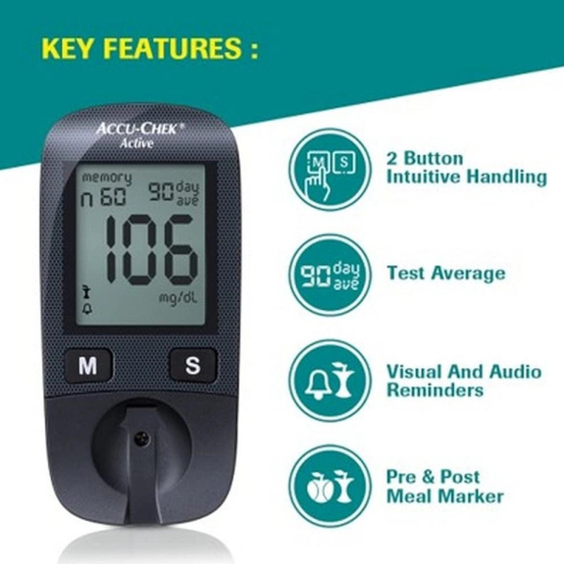 The AccuChek Active Meter Blood Glucose Monitor is user-friendly, featuring a large LCD screen, one-button navigation, and a memory function to store previous readings. This glucometer with free strips is ideal for daily testing and can be used with minimal training, making it perfect for home use.