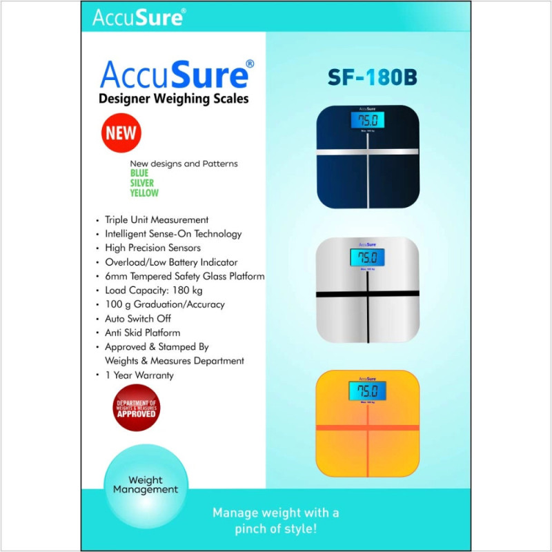 AccuSure Digital Weighing Scales offer accurate tracking of body weight with elegant design. The SF-180B weighing machine is a reliable personal weight scale. AccuSure Digital Weighing Scales feature a large LCD, high precision sensors, and stylish tempered glass. Use AccuSure Digital Weighing Scales to manage your fitness and health goals easily with this digital bathroom scale and body weight monitor.