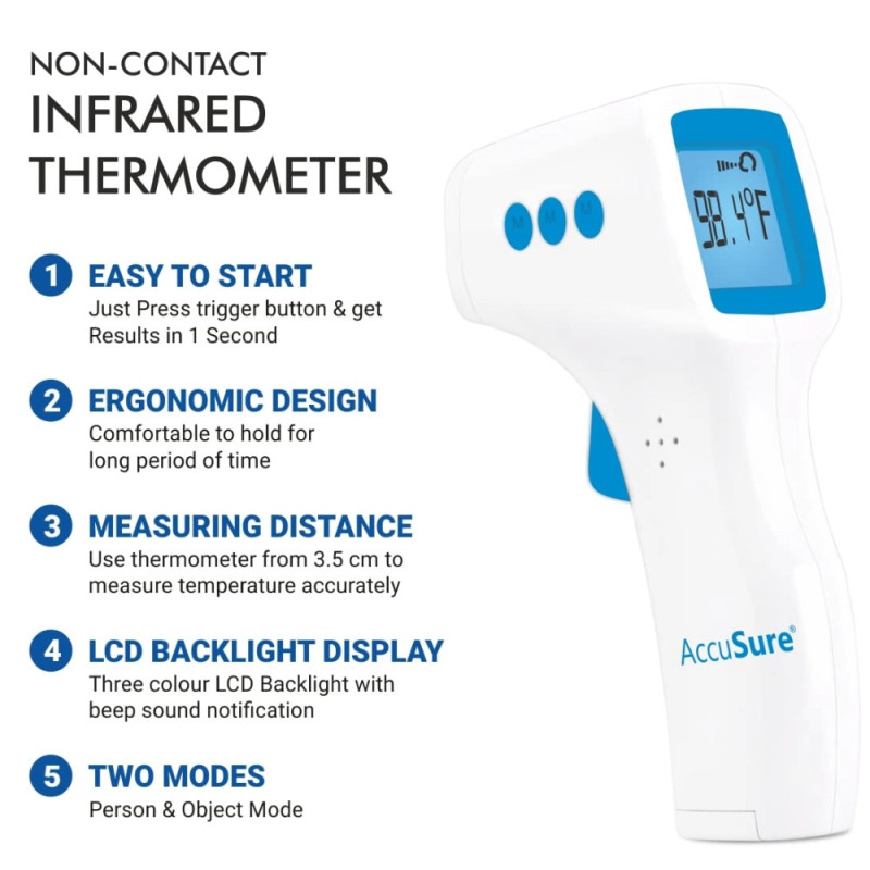 The AccuSure HS Non-Contact Infrared Thermometer is a handheld device that allows you to take your temperature or the temperature of a surface without touching it. This makes it a convenient and hygienic way to take your temperature, especially if you are caring for someone who is sick.