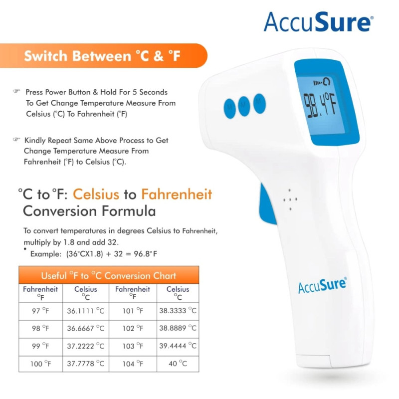 The AccuSure HS Non-Contact Infrared Thermometer is easy to use. Simply point the thermometer at the forehead or surface you want to measure, and press the button. The thermometer will display the temperature on the LCD screen within seconds.