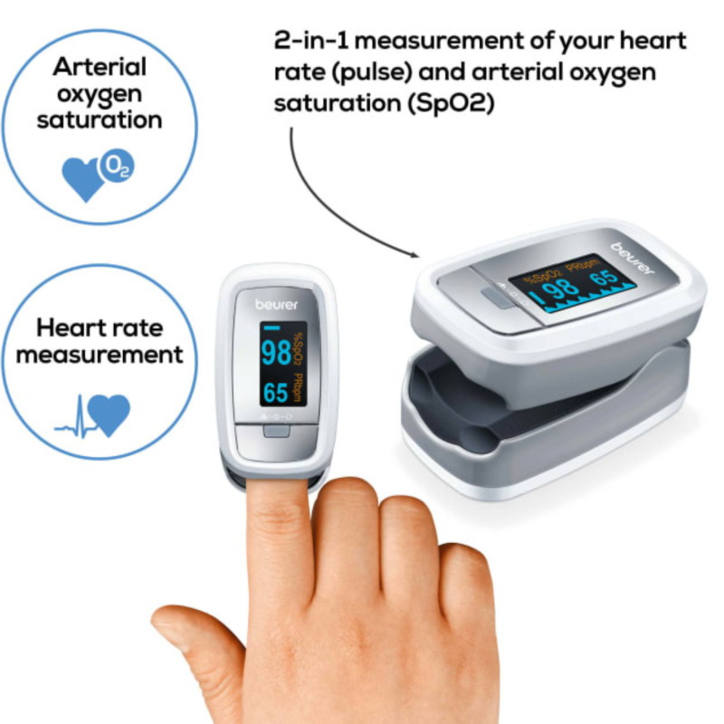 The Beurer PO 30 Pulse Oximeter is a reliable blood oxygen monitor that lets you quickly and easily check your oxygen saturation (SpO2) and pulse rate. Designed for personal and medical use, this device helps you monitor vital signs—especially useful for individuals with heart conditions, asthma, or high-altitude training needs.