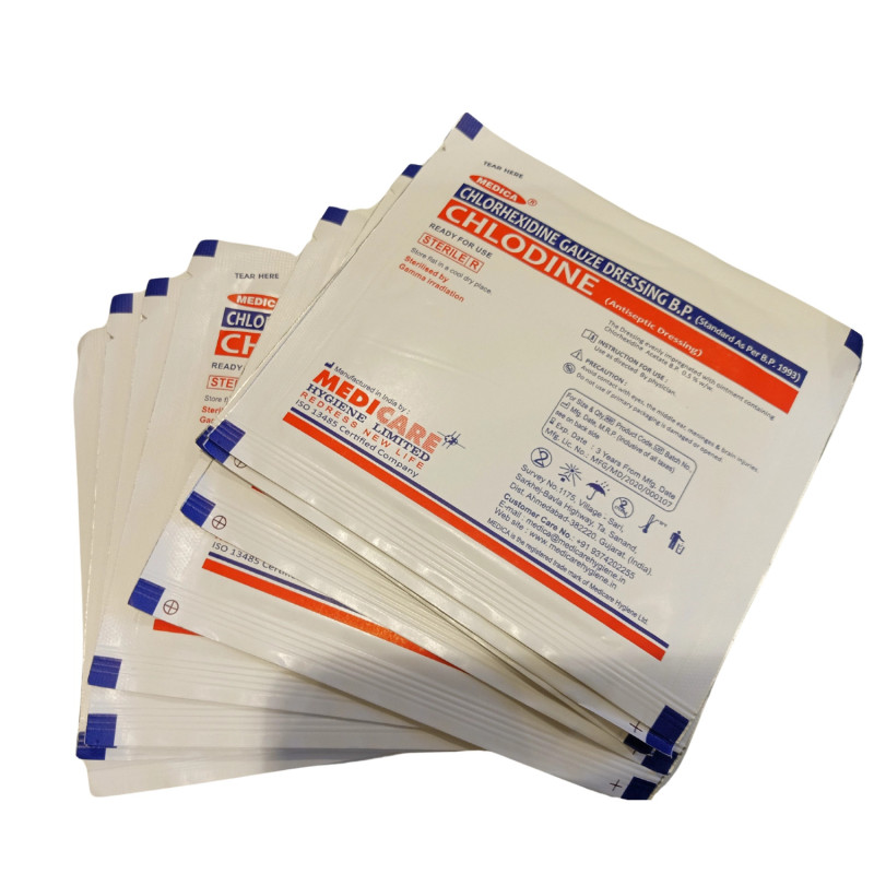 Chlorhexidine Gauze Dressing B.P. (Chlodine) is a high-quality antiseptic wound dressing designed to prevent infections and promote healing. This sterile gauze is infused with chlorhexidine, an effective antimicrobial agent that eliminates bacteria, fungi, and other harmful microbes.