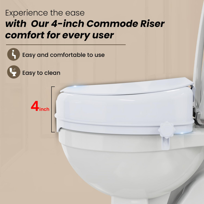 Made from high-quality, medical-grade plastic, the Commode Elevated 6 inch is durable, lightweight, and easy to clean. It fits securely on most standard toilet bowls, providing added safety and comfort. The contoured surface makes it more comfortable than traditional toilet seat risers, and its wide design offers better support.