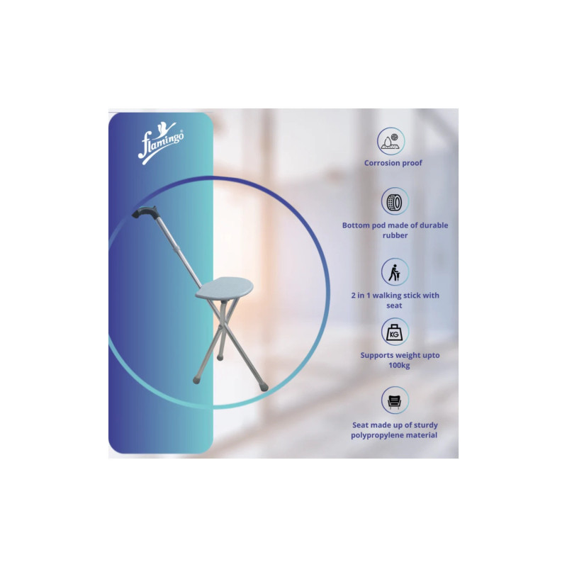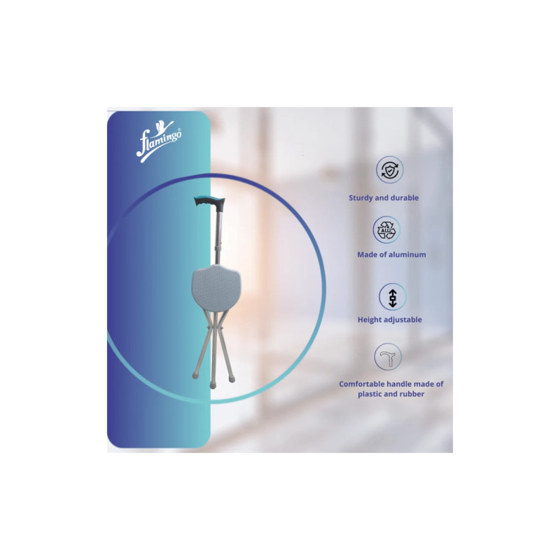 The Flamingo Classic Walking Stick With Seat OC 2297 is a versatile mobility aid designed for seniors and those with limited mobility. It offers reliable support while walking and features a foldable seat for resting when needed. Crafted from lightweight yet durable materials, this walking stick is easy to carry and store. Its ergonomic handle ensures a comfortable grip, while the sturdy legs provide stability. Ideal for outdoor and indoor use, the Flamingo Walking Stick With Seat is a perfect companion for enhanced independence