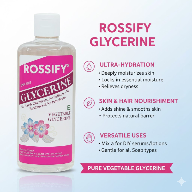 Rossify Pure Vegetable Glycerine offers intense hydration and natural glow. This Rossify Pure Vegetable Glycerine is ideal for dry skin and dull hair. Rossify Pure Vegetable Glycerine deeply nourishes your skin, acting as a natural skin moisturizer. It’s perfect for daily use as pure glycerine for face, and also works as vegetable glycerine for dry skin and scalp.