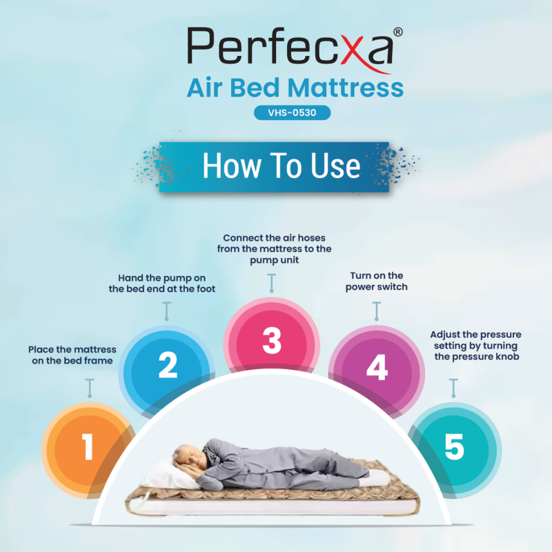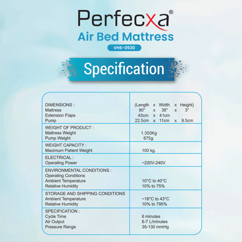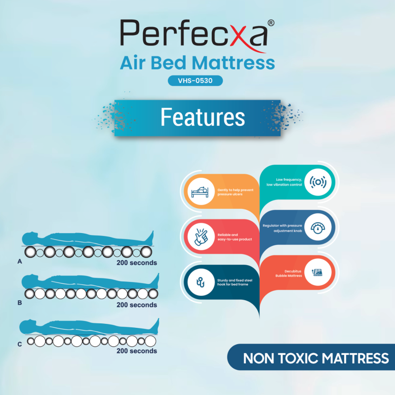 The Perfexa Anti-Decubitus Air Pump and Mattress System VHS-0530 is compatible with standard hospital beds and designed for long-term durability. Its Alternating Pressure Mattress technology provides quiet operation, ensuring a peaceful environment for rest and healing.
