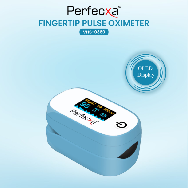 The Perfexa Fingertip Pulse Oximeter VHS-0360 provides fast and accurate oxygen saturation and pulse rate readings. This Digital Pulse Oximeter features a bright OLED display, compact design, and simple operation for home, clinic, or travel use. The Perfexa Fingertip Pulse Oximeter ensures reliable, non-invasive monitoring. Trust the Perfexa Fingertip Pulse Oximeter for precise and quick health assessment anytime.
