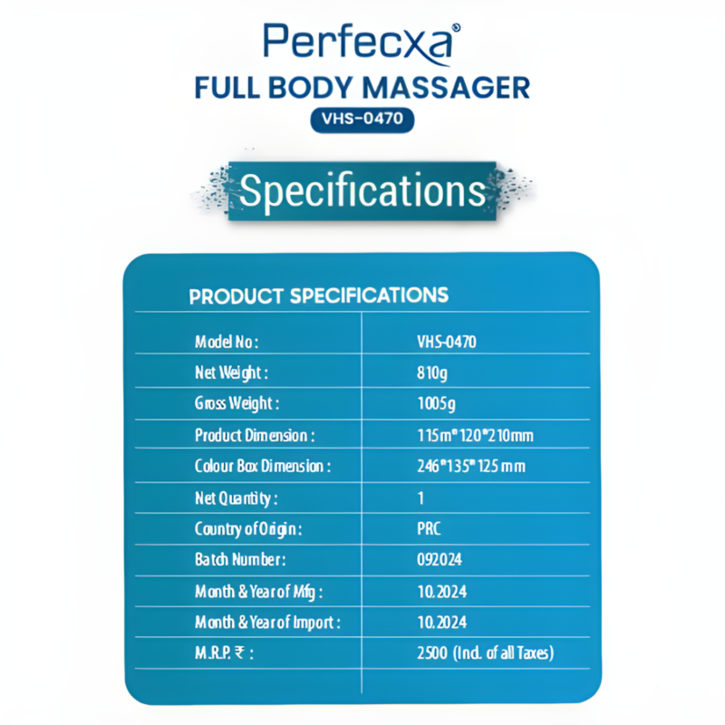The Perfexa Full Body Massager VHS-0470 provides deep tissue relaxation and effective pain relief. This Electric Body Massager features multiple massage modes, adjustable intensity, and ergonomic design for comfort. The Perfexa Full Body Massager is ideal for home use, relieving muscle tension, fatigue, and stress. Trust the Perfexa Full Body Massager for a professional-level massage experience anytime.