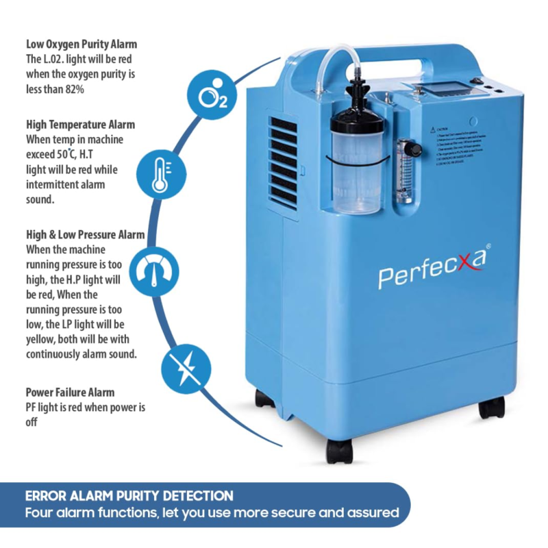 The Perfexa Oxygen Concentrator features a digital control panel for easy oxygen level monitoring, automatic alarms for low purity or power failure, and a durable body suitable for continuous 24-hour use. Whether for home recovery or hospital treatment, this Portable Oxygen Machine ensures consistent support for optimal respiratory care.