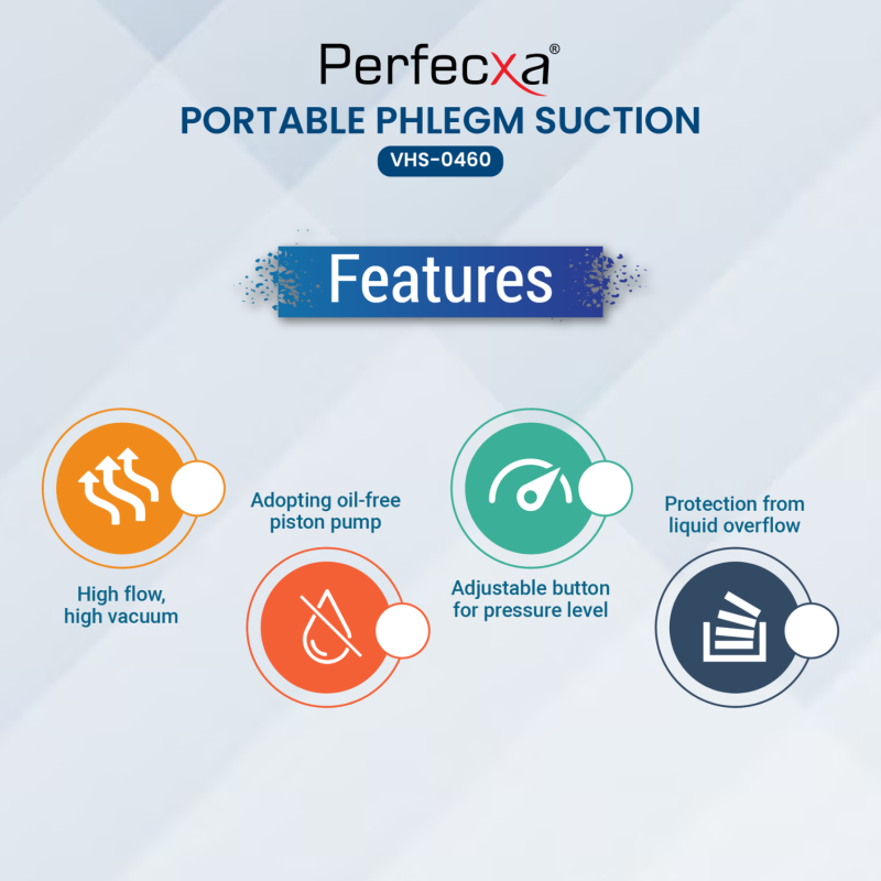 The Perfexa Portable Phlegm Suction Machine is an advanced medical suction machine for home use designed to remove mucus, saliva, and fluids from the respiratory tract. It’s especially helpful for patients with breathing difficulties, post-surgery care, and elderly individuals who need continuous airway clearance.