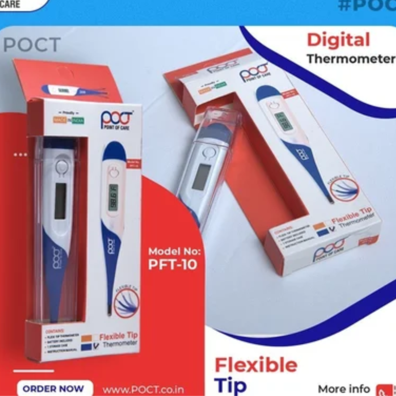 Monitor body temperature instantly with the POCT Digital Thermometer PFT-10, a precise and Fast Reading Thermometer trusted for home and clinical use. The POCT Digital Thermometer offers quick, accurate results with an easy-to-read LCD display. Its durable design, memory function, and flexible tip make temperature measurement safe and simple for all ages, anytime you need reliable results.