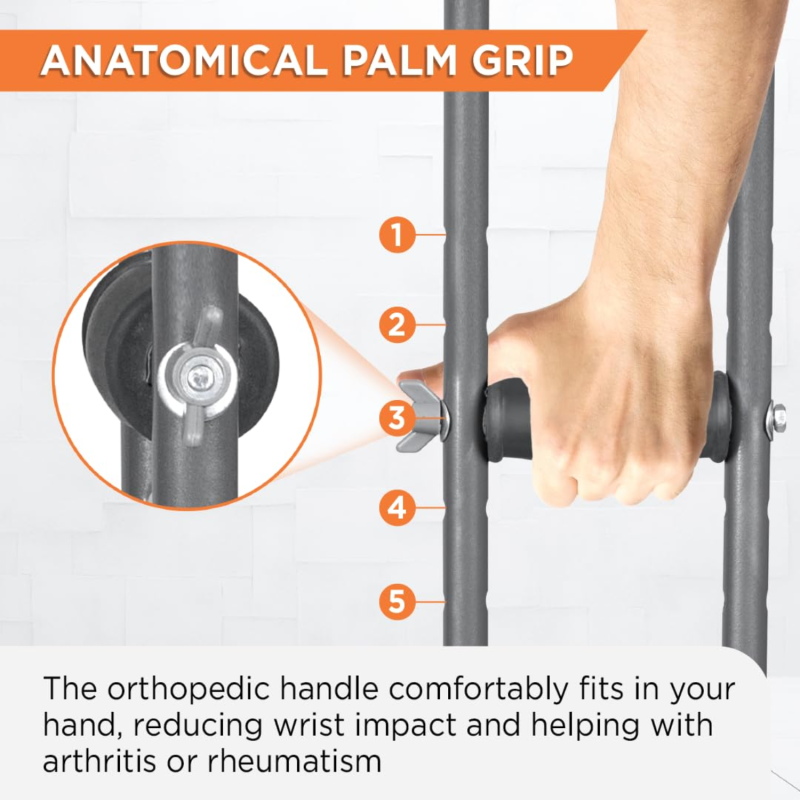 These adjustable underarm crutches feature a simple height adjustment mechanism, making them adaptable to different users. This ensures optimal comfort and effectiveness, whether you’re recovering from an injury, post-surgery, or managing long-term mobility challenges.