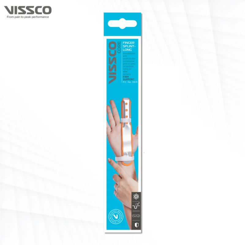 The Finger Splint Long by Vissco PC 0631 is designed to stabilize and protect injured fingers. This Finger Splint Long helps in recovering from fractures, tendon injuries, or post-surgical care. Its aluminum support and foam padding ensure comfort and rigidity. The Finger Splint Long also acts as a dependable finger fracture support, promoting fast healing while minimizing movement and pain.