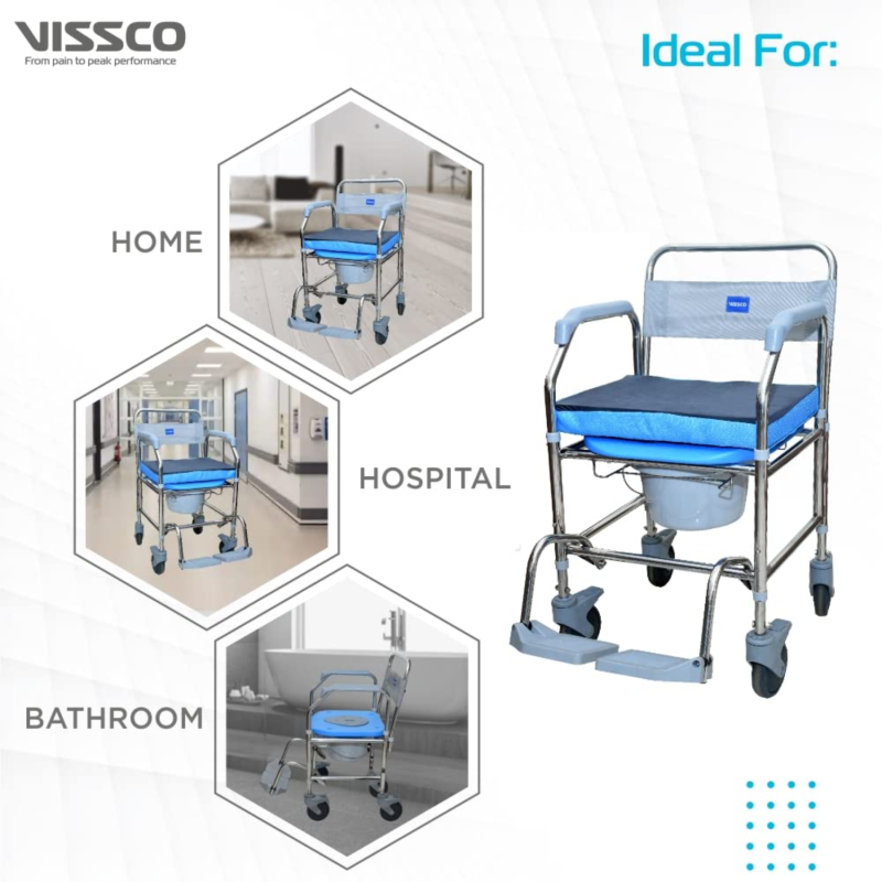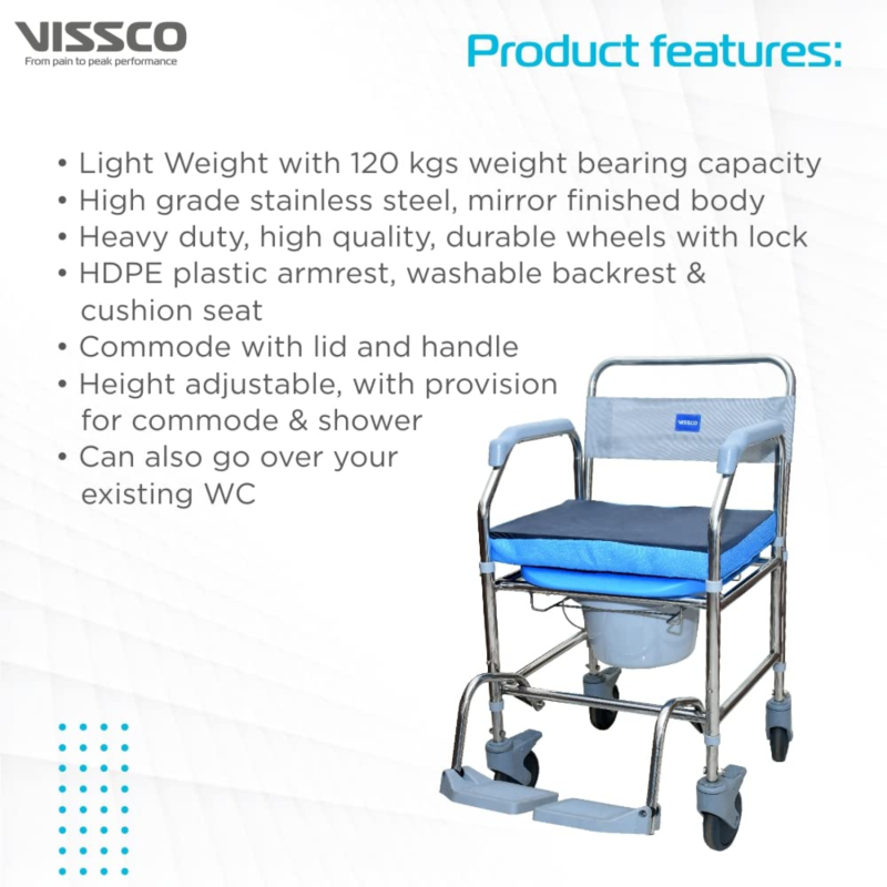 The Vissco PC 9969 Comfort SS Shower Commode Wheelchair is a versatile mobility aid designed for convenience and hygiene. Built with a rustproof stainless steel frame, it doubles as a height adjustable commode wheelchair, making it ideal for both shower use and bedside assistance. With a padded seat, smooth wheels, and adjustable height settings, it ensures comfort, safety, and easy transfers for users needing daily mobility support.
