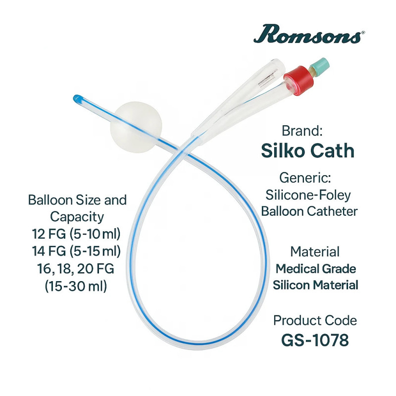 The Romsons Silicone Foley Catheter (GS-1078) is a premium 100% silicone adult Foley catheter crafted for long-term urinary catheterization in hospitals, ICUs, and homecare environments. Designed with patient comfort in mind, this Romsons Silko Cath is completely latex-free, reducing the risk of allergic reactions and ensuring biocompatibility with sensitive skin.