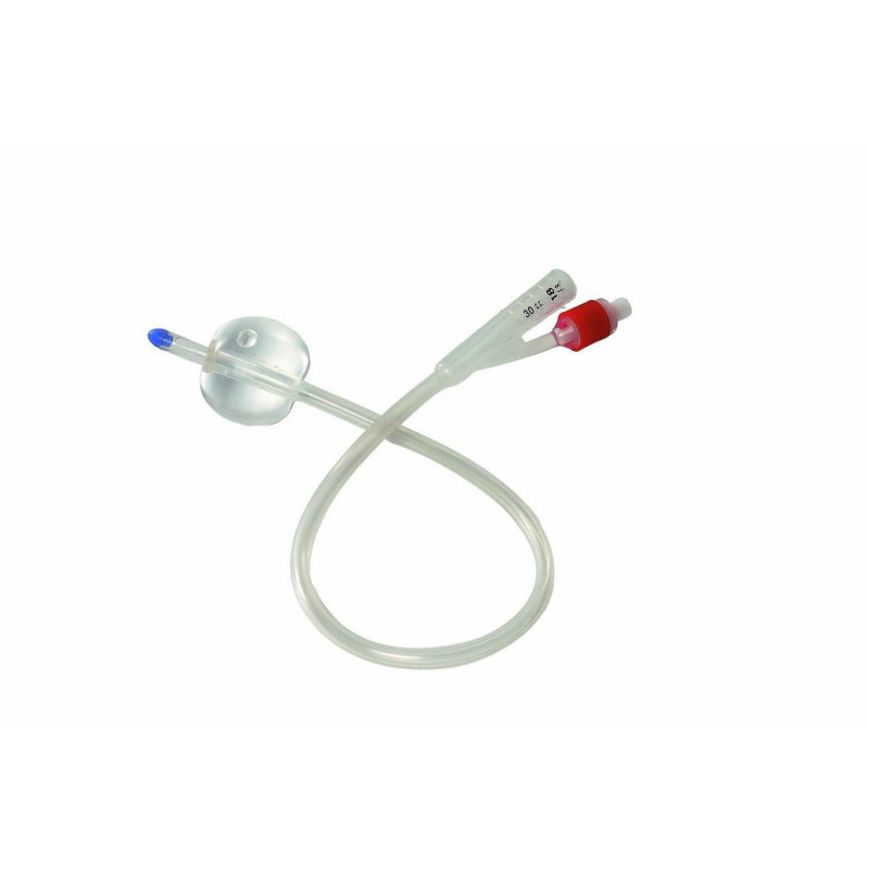 The silicone adult Foley catheter features a two-way design—one lumen for urine drainage and the other for balloon inflation. Its clear body allows for easy visual inspection, and the universal funnel fits standard drainage bags. The catheter is individually sterile-packed and ready to use, ensuring hygienic application in any clinical or home setting.